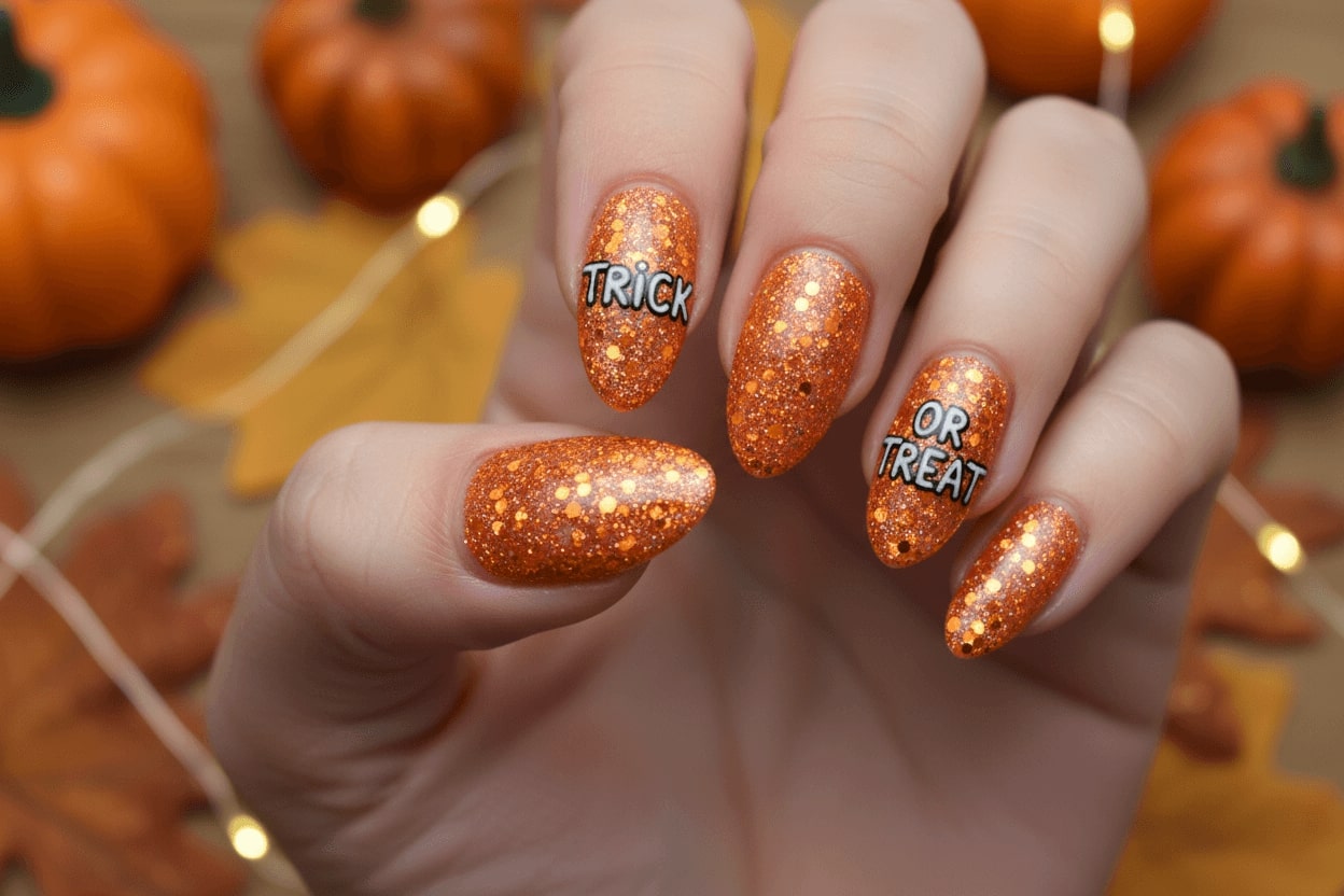 24. Look for some fall nail ideas? Try this orange glitter nails with "Trick or Treat" lettering.